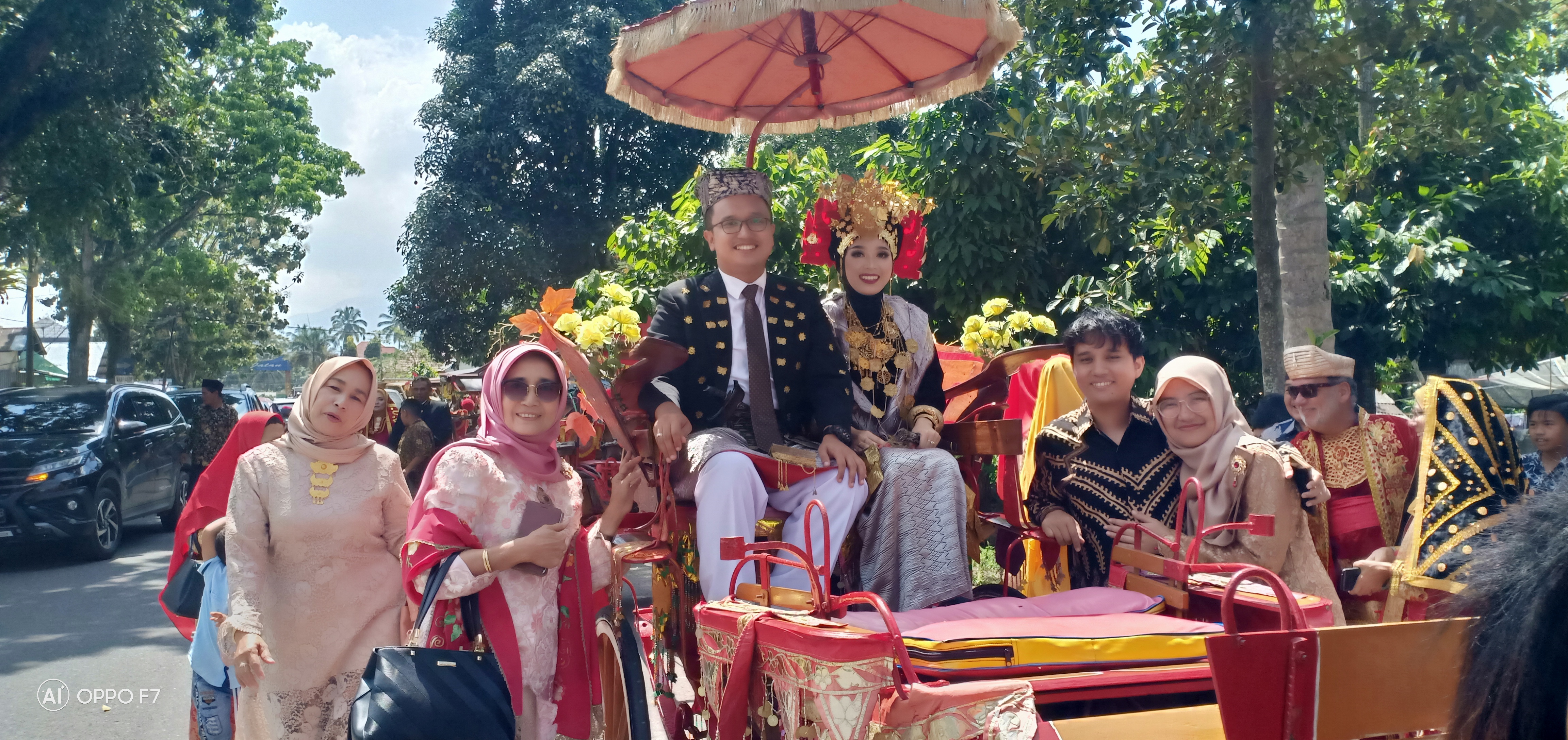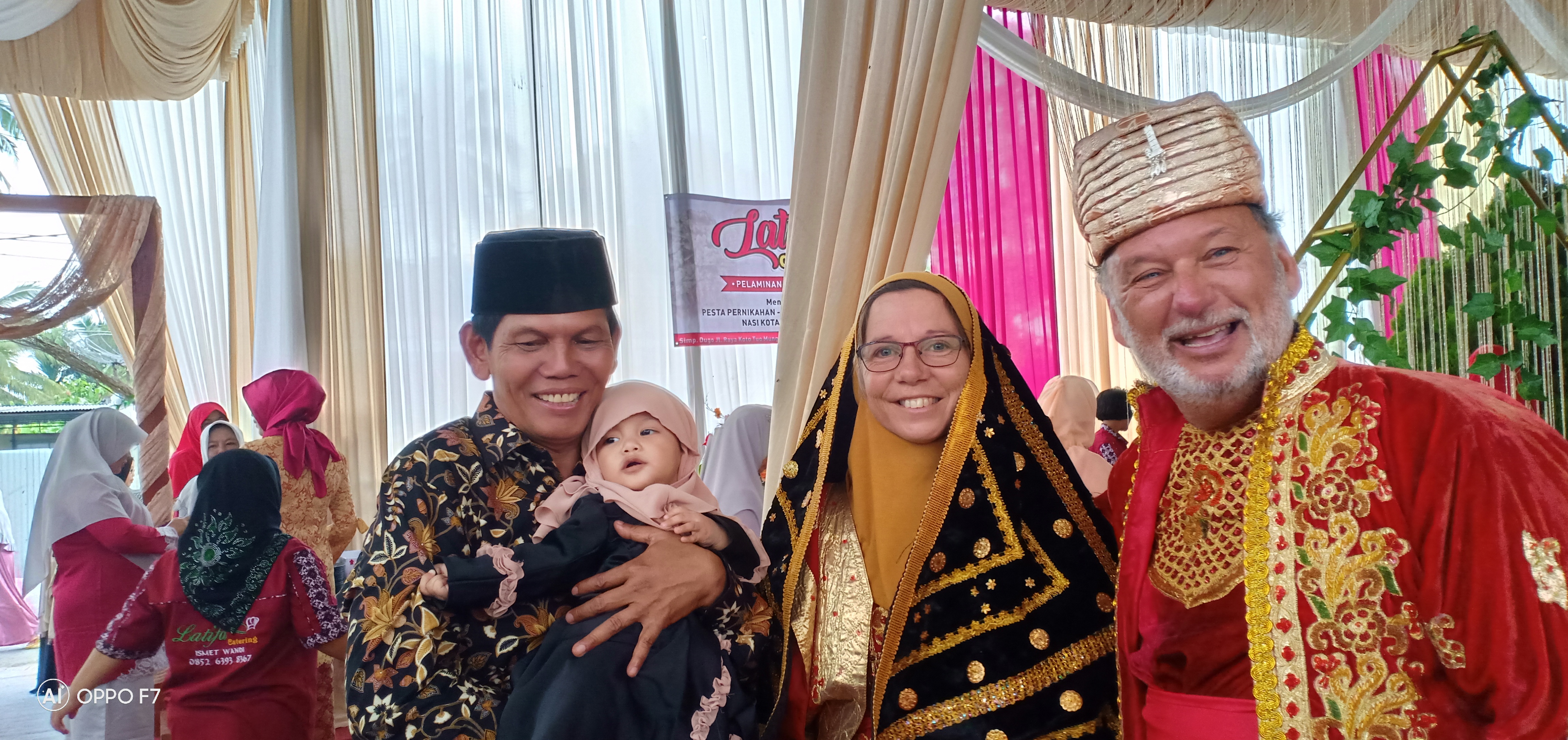 When we arrived on the scene, the highly decorated carriages were already ready to leave for the procession following the bride and groom’s carriage. With the help of Shofwan and Imnati, Claude and I quickly put on our costumes and then took a seat with Shofwan in the carriage behind the bride and groom’s. The procession then set off. Under the watchful eye of onlookers and escorted by a police car, we crossed the city, taking the main street. The wedding was quite an experience for Claude and me. We were all the rage with our costumes rented for the occasion but, as we got hot! Everyone wanted to be photographed with the bride and groom and with us. The photo shoot lasted for more than two hours. We were treated like VIPs. In fact, we felt like sultan and sultana! We mentioned our names on the microphone at least three times to welcome us! We served ourselves at the excellent hot buffet. We felt very privileged to be able to attend an Indonesian wedding. What an extraordinary experience!