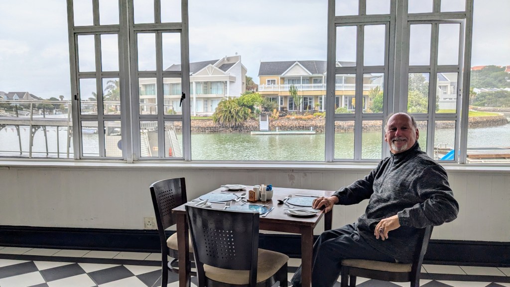Nous sommes partis tôt car nous avions 565km à parcourir (6h30m de route). Nous avons roulé deux heures sous la pluie, sur la belle route R72, jusqu’à Port Alfred. Nous avons fait un arrêt au Royal Alfred Marina. Nous avons partagé un petit-déjeuner au restaurant du très chic hôtel The Halyards. La vue sur les canaux et les grandes maisons cossues qui les bordent est impressionnante.