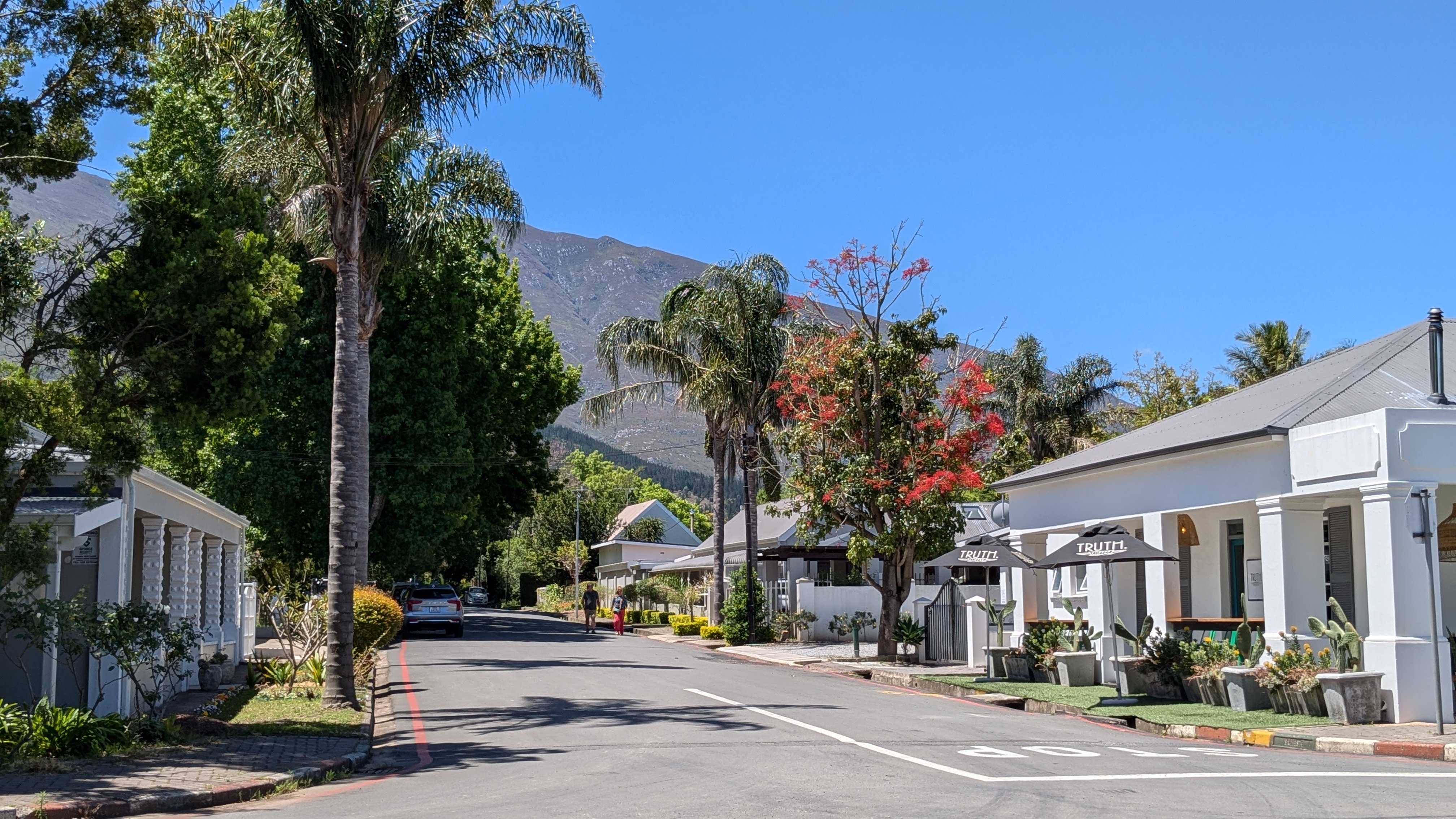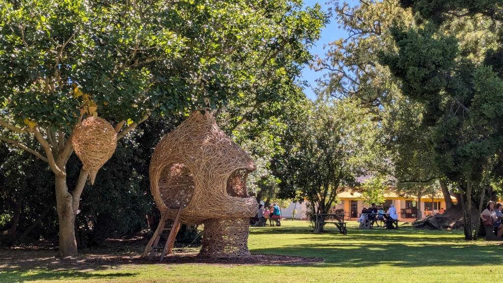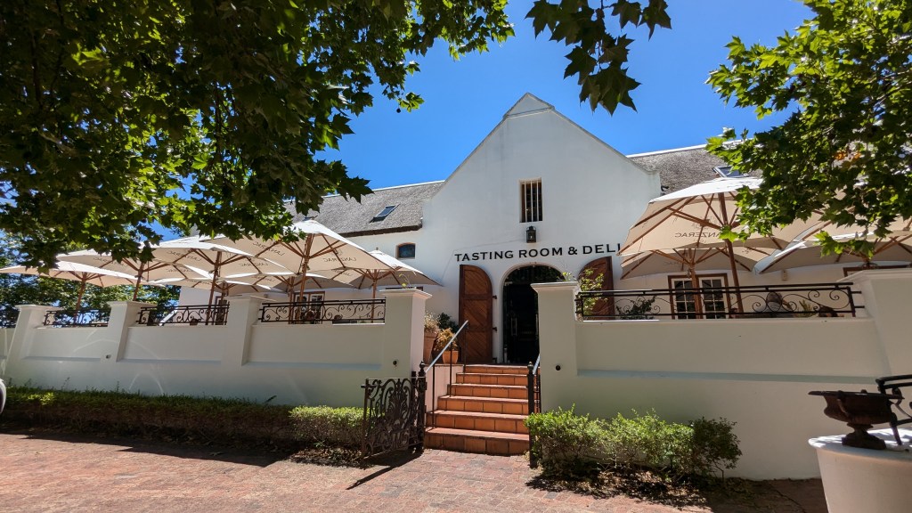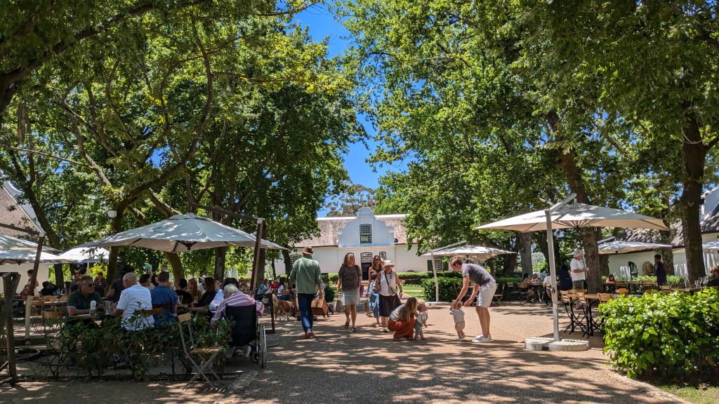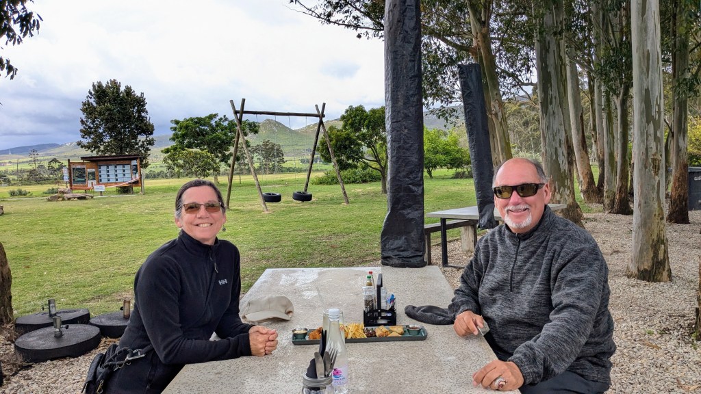Nous avons dîné à Swellendam, à mi-chemin entre Mossel Bay et Fisherhaven. Le petit village, situé au pied des très hautes montagnes escarpées du Drakensberg, est tout à fait charmant. Nous avons opté pour le restaurant La Belle Ambiance. Assis sur la terrasse surplombant la petite rivière Koornlands, nous avons partagé une assiette de spaghetti bolognese au son de l’eau descendant la rivière et des airs mélodiques joués par un saxophoniste, le tout dans une nature luxuriante. Quel arrêt relaxant ! Nous avons marché sur la Main Street, découvrant ses restaurants et petites boutiques de luxe, avant de reprendre la route.