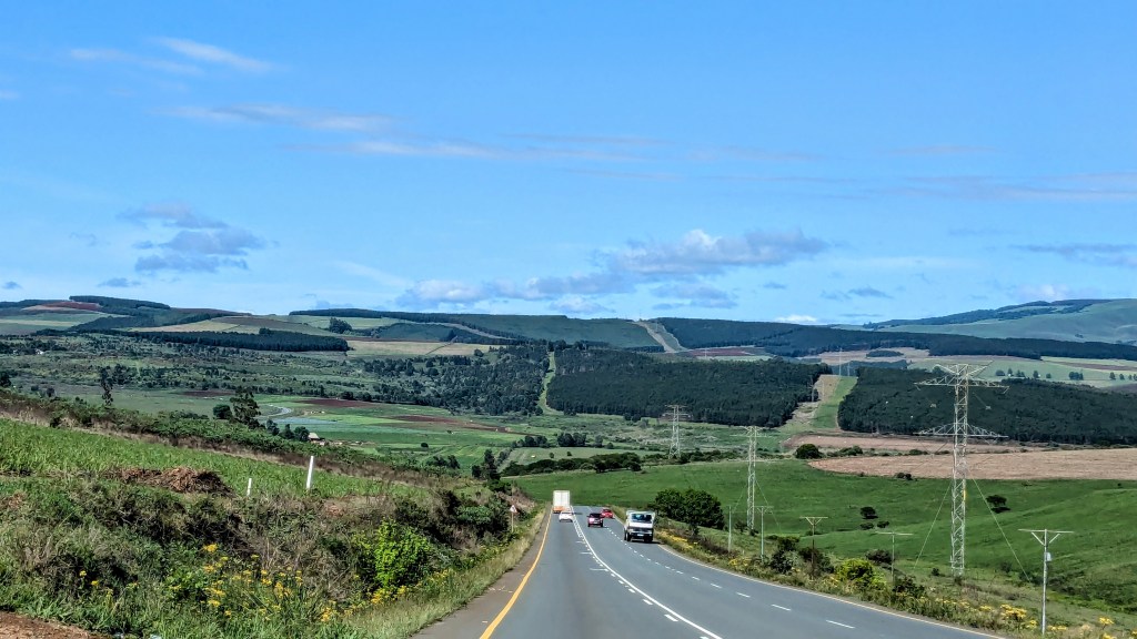 Nous avons poursuivi notre chemin par la belle route N2. La chaîne de montagnes du Drakensberg n’a cessé de nous épater. Quels paysages enchanteurs nous avons vus ! Montagnes escarpées, profonds canyons, immenses vallées, plaines et plantations se succèdent, créant des images de cartes postales. Tout au long du trajet, nous avons croisé une multitude de troupeaux de moutons, de vaches et même d’autruches à Heidelberg !