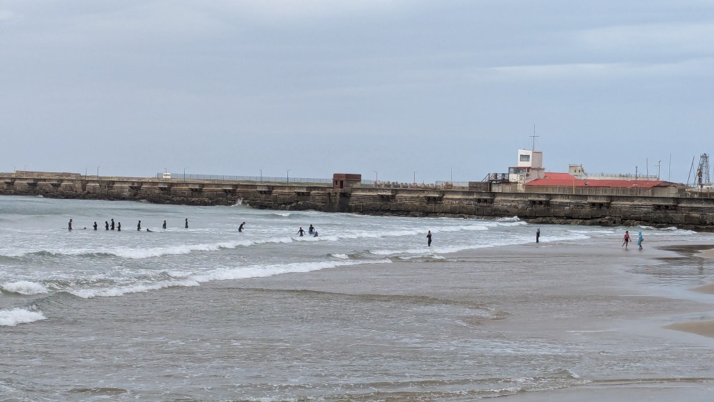 Nous sommes ensuite allés voir Bonza Bay Beach, située à mi-chemin entre Gonabie Beach et Nahoon Beach (à East London). En ce dimanche frais, c’est avec surprise que nous avons vu une centaine de Noirs (surtout de jeunes enfants) en train de se baigner dans l’océan agité. Ils se tenaient sur le bord, évitant ainsi les fortes vagues et le dangereux courant d’arrachement. Nous nous sommes assis dans le sable chaud pour profiter de cette belle et immense plage, tout en prenant plaisir à regarder les baigneurs et les joueurs de soccer.