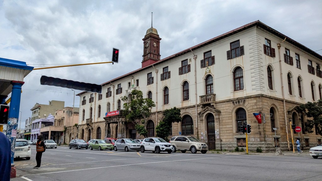 Nous nous sommes ensuite rendus au East London City Hall situé en plein centre-ville. L’imposant et magnifique édifice colonial avec sa tour de l’horloge domine la North Street. Nous avons marché sur cette artère commerciale importante et achalandée, nous méfiant des voleurs potentiels dans ce quartier où la pauvreté se voit et se sent. Nous avons pu voir d’autres édifices de l’époque coloniale dont le magnifique Bureau de poste. Nous nous sommes arrêtés pour dîner dans un petit restaurant pakistanais. Nous avons dégusté un délicieux chow mein servi avec pain naan à l’ail et un excellent thé chai pakistanais.