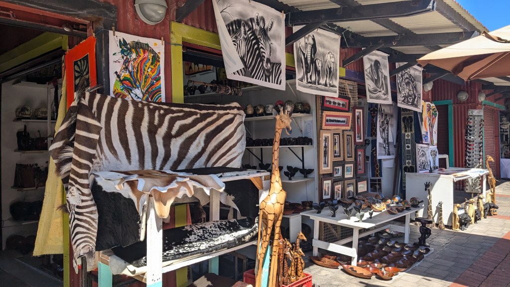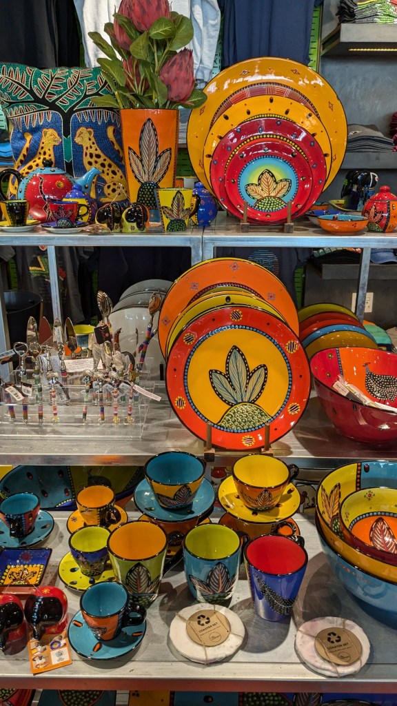 La responsable des lieux, une Noire fort sympathique qui vit ici avec son mari et ses deux enfants (8 et 15 ans) et dont j’oublie le nom, nous a réservé un accueil chaleureux. Nous nous sommes installés et avons fait la sieste avant de partir avec un Uber Taxi vers Rosebank Mall. Nous avons fait le tour de ce grand et luxueux centre commercial. Nous avons soupé sur place à la terrasse du restaurant Opera et je suis allée voir le Art & Craft Market situé juste à côté en attendant d’être servie. Ce marché d’artisanat sur deux étages est immense et les étales débordent de marchandise colorée et attrayante.