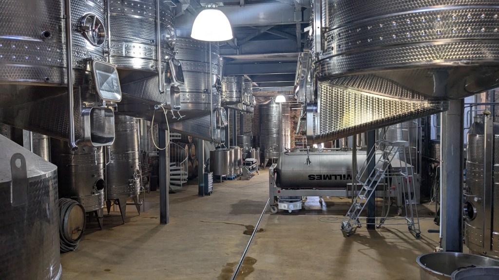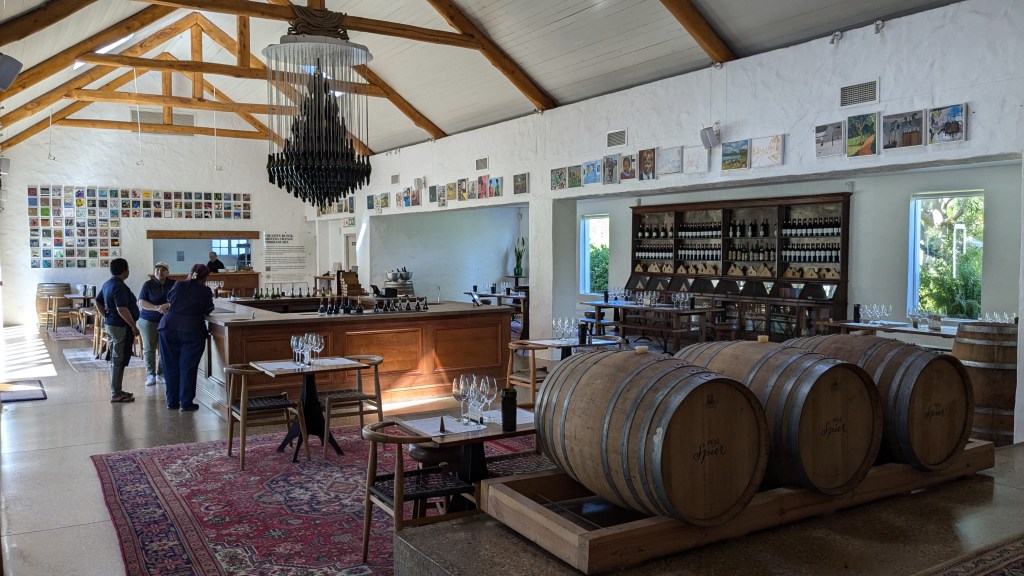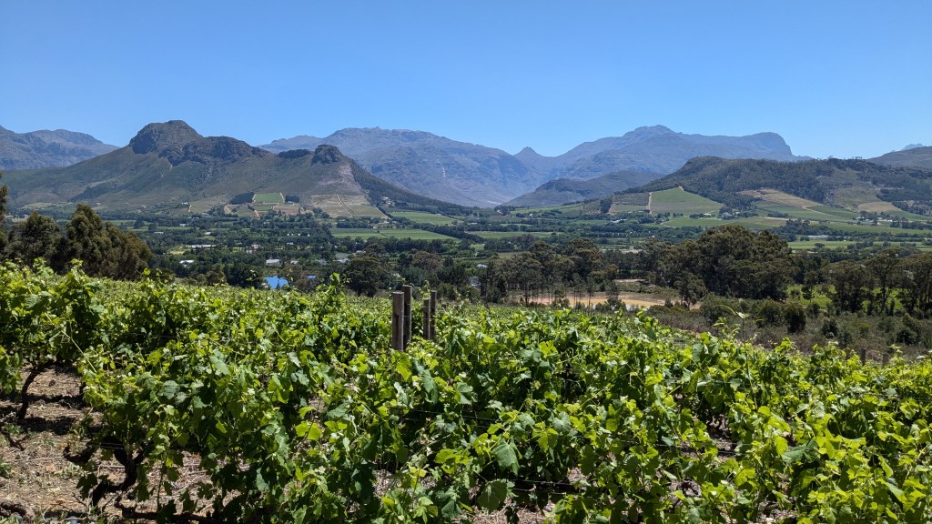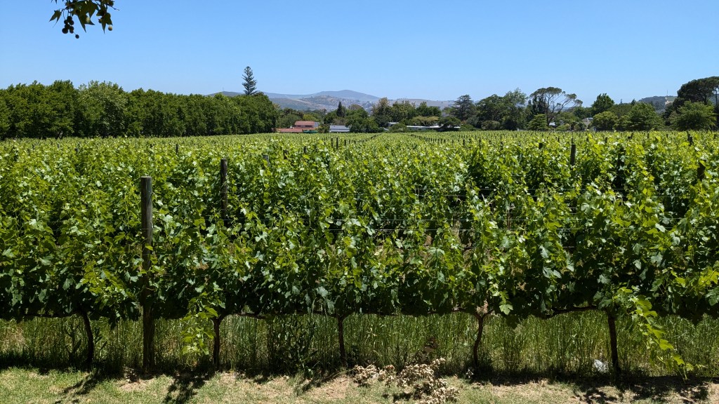 Sur la route des vins, dans la superbe vallée Hemel-en-Aarde, nous sommes passés devant plusieurs vignobles. Ria nous avait conseillés de nous rendre au vignoble Newton Johnson pour sa vue panoramique sur les champs de vignes et les montagnes. Quel émerveillement à la vue de ce paysage extraordinaire, unique et sublime ! Nous aurions pu déguster leur vin Newton Johnson mais, nous nous sommes plutôt contentés de la vue panoramique du haut de la terrasse du restaurant. C’est avec intérêt que nous avons aperçu la salle des machines pour la confection du vin à travers une grande fenêtre vitrée.
