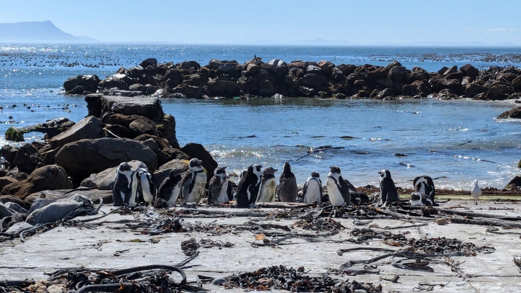 La route panoramique offre une vue incroyable sur l’océan. Nous avons traversé Simon’s Town, enchantés par ses belles maisons à flanc de montagne et sa rue principale animée et débordante de restaurants et petites boutiques pour les nombreux touristes qui viennent voir les colonies de pingouins africains. Plusieurs des bâtiments datent de l’époque coloniale et sont bien préservés. En bordure de la route, on peut voir des pancartes « Pingouins » et « babouins » avertissant les conducteurs de la présence de ces mammifères dans la ville. Nous sommes allés directement à Boulders Beach. Une longue passerelle relie le stationnement à la billetterie (23$CAD chacun). De cette passerelle qui surplombe la berge, nous pouvons déjà apercevoir les mignons petits pingouins. Passé la billetterie, une autre passerelle mène à une plateforme où les touristes se bousculent une place pour observer les pingouins de plus près. C’est un moment magique que de se retrouver si près d’eux, dans leur superbe milieu naturel. Un peu plus loin, une immense colonie de goélands (je pense) recouvrait un immense rocher. Quelle belle faune!