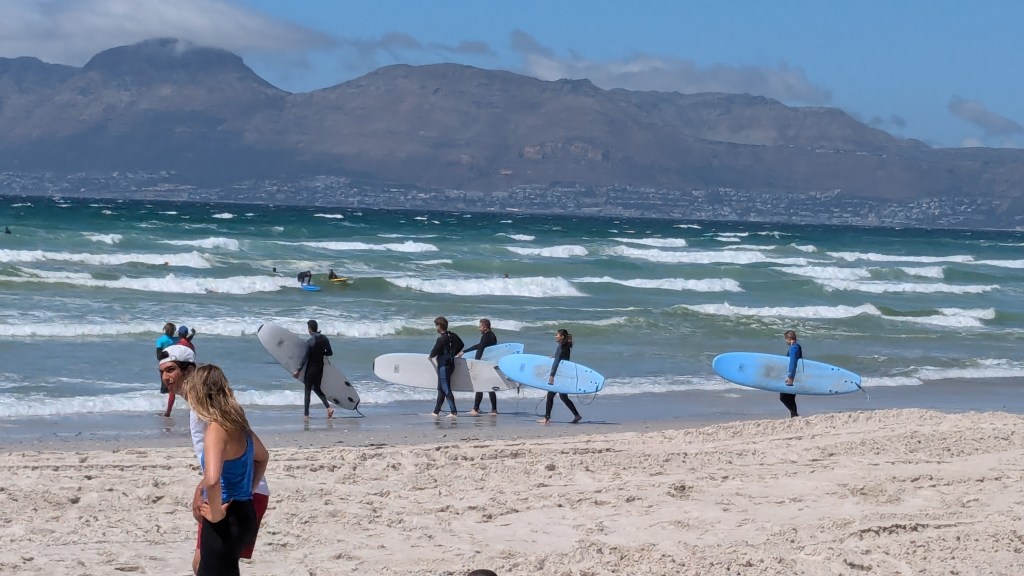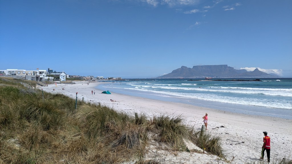 Nous avons rebroussé chemin et avons fait un arrêt à la Big Bay Beach. Cette plage animée est propice à la baignade et au surf. Une série de restaurants avec terrasse surplombe la plage et offre une des plus belles vues de Table Mountain.