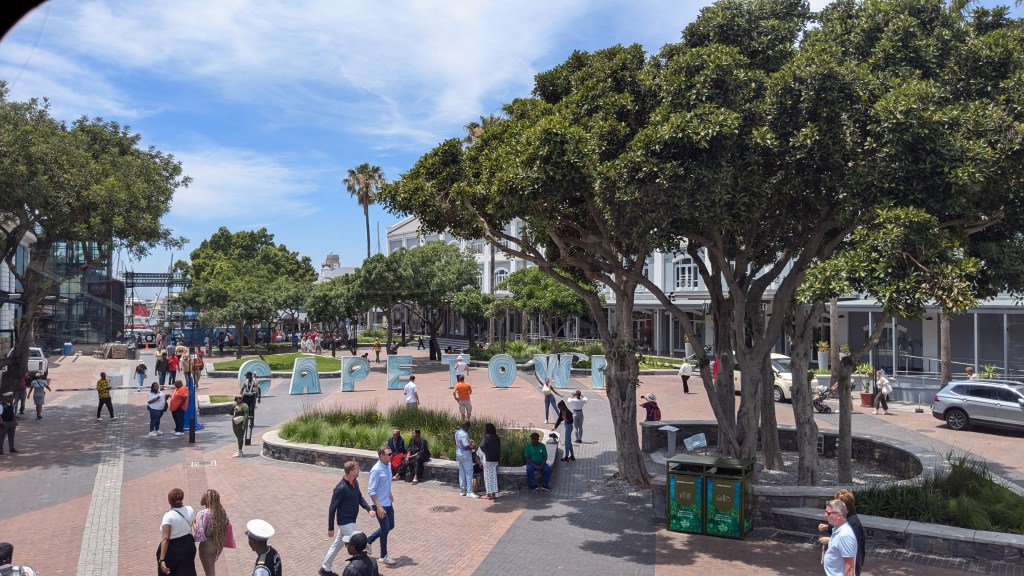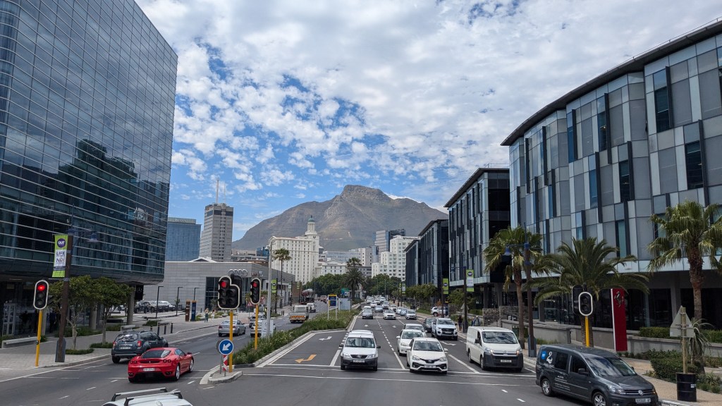 Nous avons pris un Uber Taxi jusqu’au Waterfront. Le chauffeur, un jeune homme du Zimbabwe (encore!), a été très sympathique avec nous. Nous avons dû nous armer de patience car nous étions pris dans le dense trafic du centre-ville.