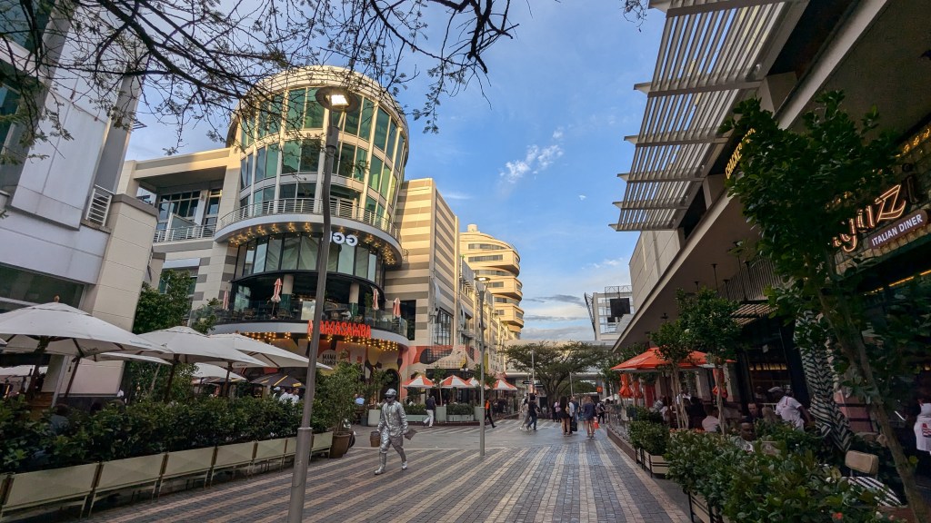 Avant que la nuit tombe, nous avons découvert la rue animée des restaurants avec terrasse dans l’autre partie commerciale appelée The Zone et qui fait face à Rosebank Mall. Quelle ambiance agréable et animée y régnait! Les arbres sont joliment décorés de lumières blanches de Noël et donnent un air de fête à ce lieu populaire et particulièrement achalandé du vendredi soir. Nous sommes repassés au Rosebank Mall pour y acheter quelques provisions pour nos déjeuners à l’épicerie SPAR. Puis, face au Starbucks, nous avons pris un Uber Taxi pour retourner à notre maison d’hôte, satisfaits de notre première sortie à Johannesburg.