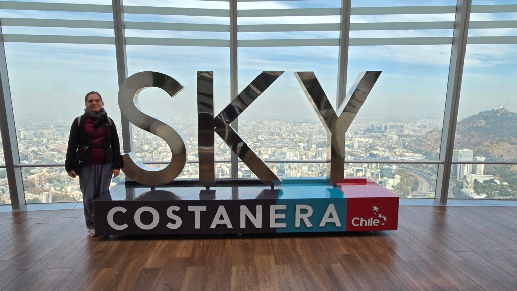 Sous une froide température de 8 degrés C, coupe-vent sur le dos et tuque sur la tête, nous avons déjeuné tout en jasant avec la femme de chambre. Nous avons ensuite marché jusqu’au complexe Costanera Center qui abrite le Cenco Malls, centre d’achat huppé de cinq étages. Nous avons acheté deux cartes SIM Claro pour nos cellulaires (3g/3200CLP ou 4.85$CAD). Nous avons dû faire trois boutiques avant de finalement arriver à activer nos cartes. Quelle histoire!