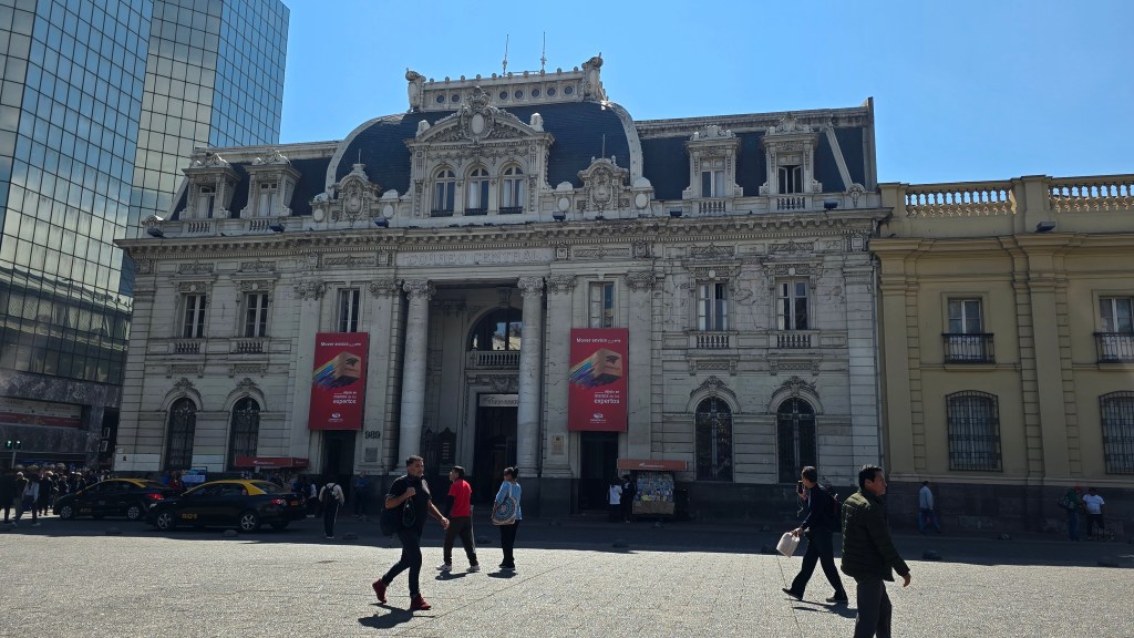 Nous nous sommes assis dans l’immense cour devant le Palais, heureux de prendre une pause et nous nous sommes contentés d’admirer l’extérieur du magnifique édifice. (Nous n’avions plus assez d’énergie pour une visite guidée.) En retournant à la station de métro Plaza de Armas, nous sommes passés à côté du Museo Chileno de Arte Precolombiano (Antiguo Palacio de la Real Aduana: Palais de la Royale Douane), autre bel et imposant édifice.