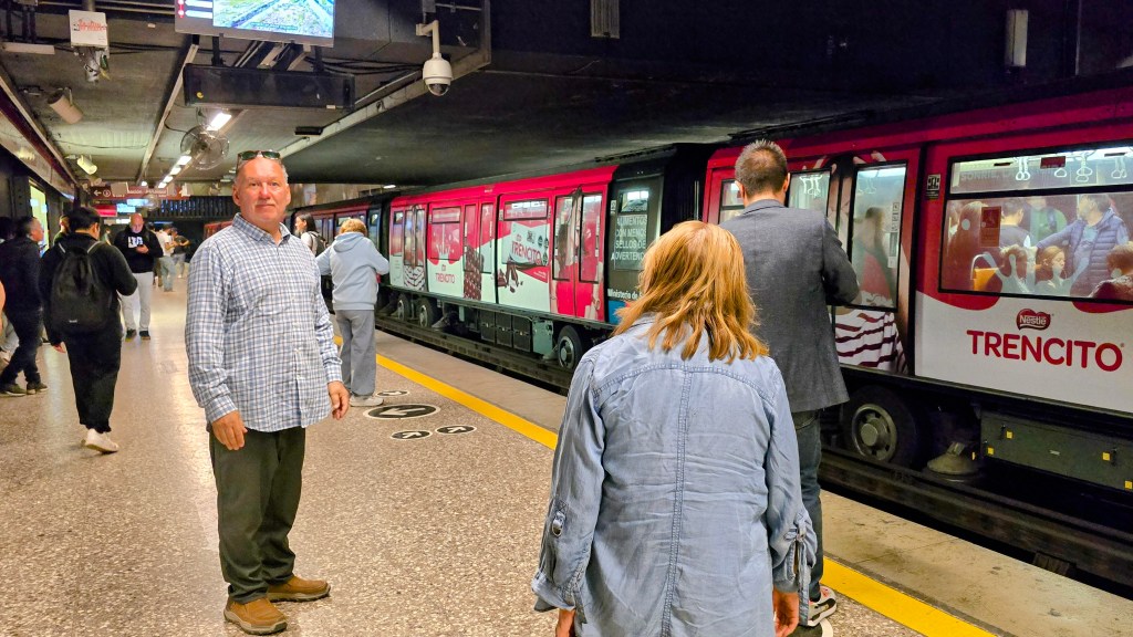 Nous avons pris notre petit déjeuner à la salle à manger de l’hôtel avant de remonter à notre chambre pour y faire nos bagages. À 10ham, nous avons laissé nos bagages à la réception et nous sommes allés marcher sur l’Avenida Florida. J’en ai profité pour dépenser nos derniers pesos argentins. J’ai acheté quelques petits souvenirs ainsi que sandwichs et brioches dans une Panaderia.