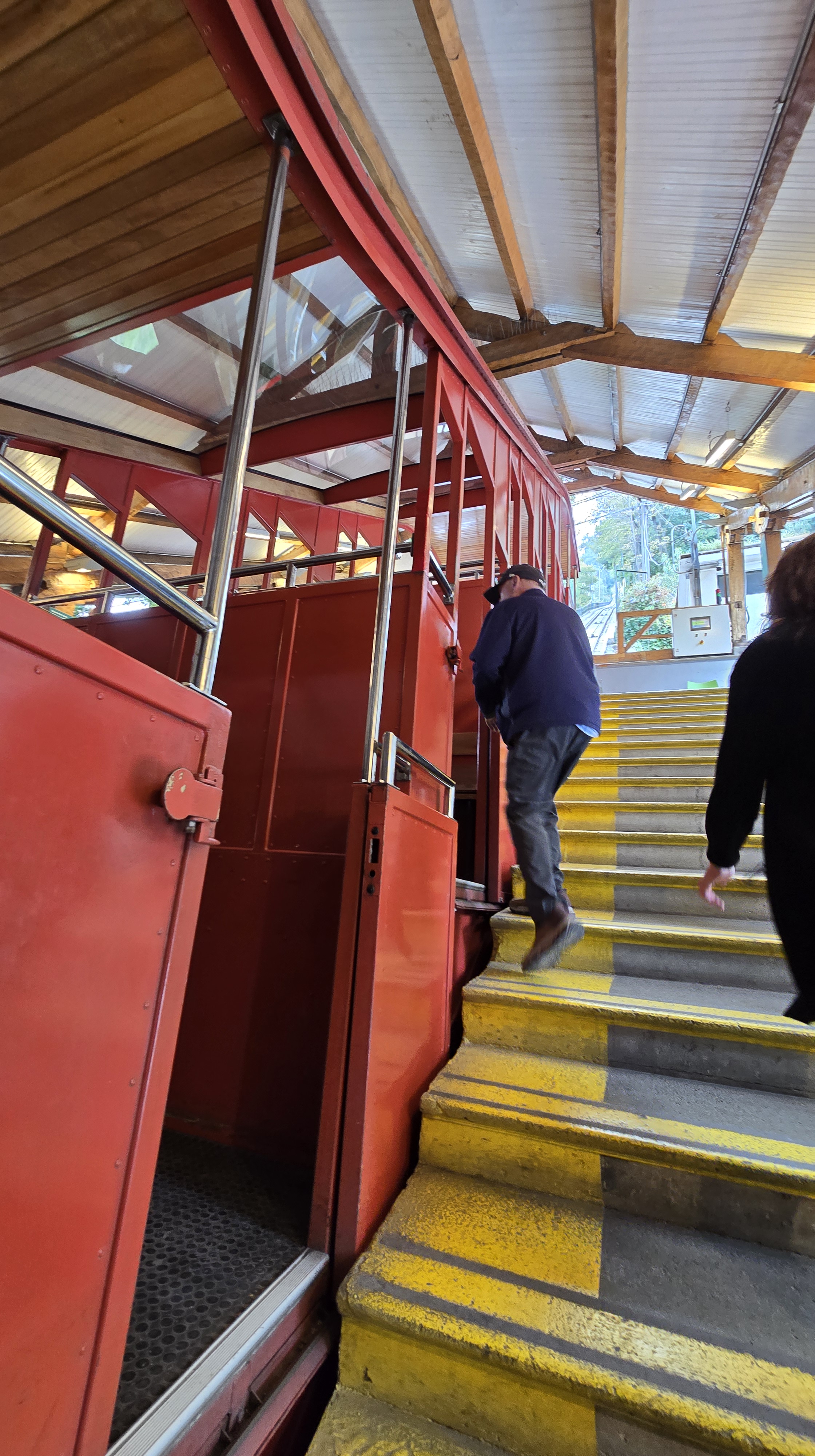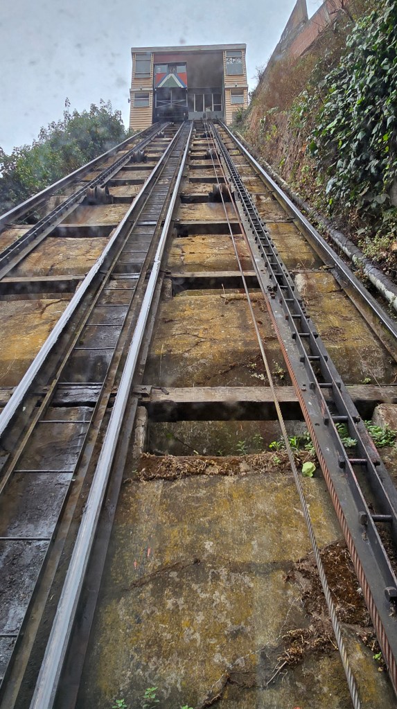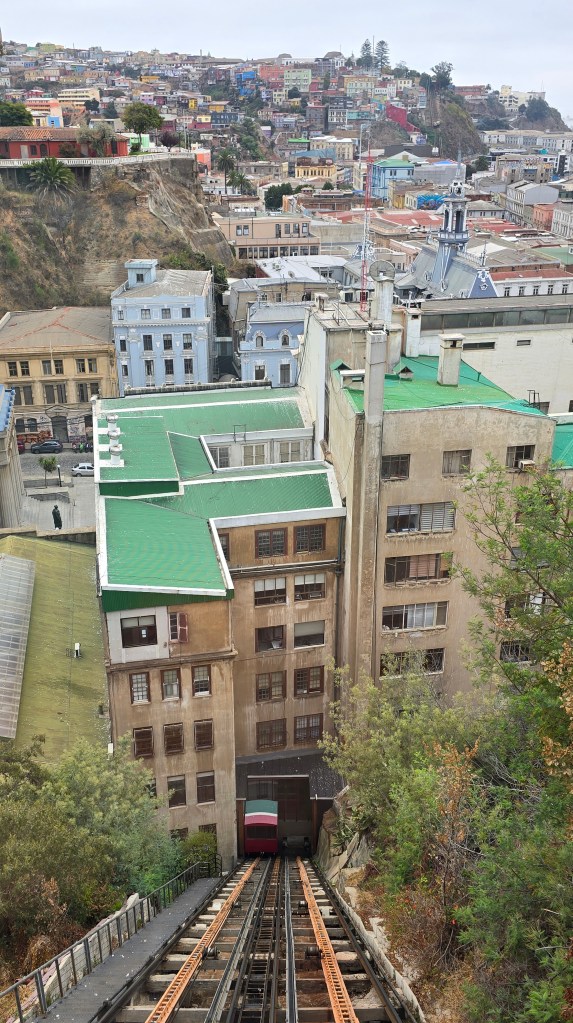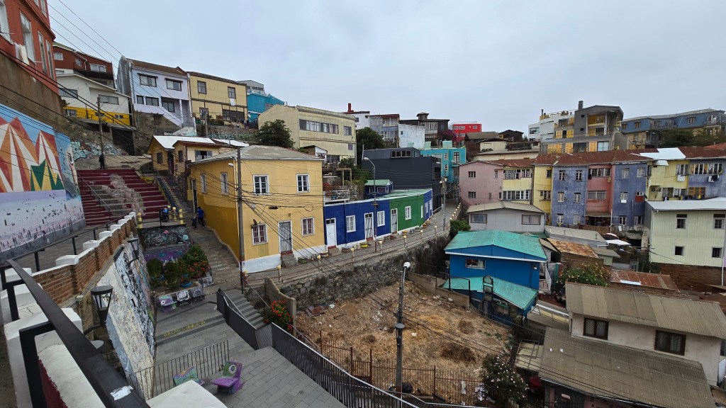 Aidés de notre voisine de siège de l’autobus, nous avons pris, avec tout notre bagage, un bus public pour nous rendre à la Plaza Victoria. Nous avons ensuite marché jusqu’au pied du funiculaire Espiritu Santo. On nous a alors informés que tous les funiculaires étaient en grève pour la journée. Une dame nous a conseillés d’aller prendre un taxi collectif (le 39) pour nous rendre en haut de la colline. (Les longs escaliers n’étaient pas une option compte tenu que nous avions nos pesantes valises en mains.) Une fois rendus en haut de la montagne, nous avons dû rouler nos valises jusqu’en bas de cette rue, soit quatre coins de rue. Ouf! Quelle histoire pour se rendre à notre appartement The Travelling Chile ! (Uber taxi affichait un prix exorbitant au moment où j’avais tenté de le réserver.)