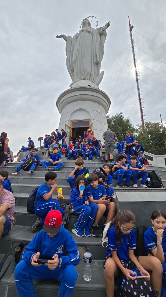 Nous nous sommes rendus au sommet du Cerro San Cristobal en funiculaire. La vue sur la ville et les Andes est magnifique et impressionnante. Du mirador, nous avons monté le long escalier pour atteindre le Santuario de Inmaculada Concepcion. On y retrouve la petite Iglesia Maternidad Divina de María (1921), la Plaza Vasca, un espace avec des milliers de restant de chandelles, et finalement, tout en haut de la montagne, la statue géante de la Vierge Marie. À l’intérieur de la haute statue se trouve une petite chapelle dominée par une autre statue de la Vierge, celle-ci de grandeur nature. L’endroit est normalement un lieu de recueillement et de prières pour les fidèles mais un large groupe d’écoliers en uniforme bleu ont envahi l’espace d’un pas dynamique et peu silencieux. Nous pouvions sentir leur joie de vivre cette sortie scolaire.
