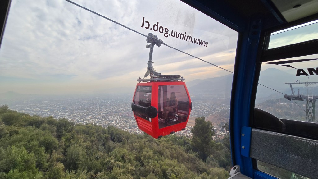 Nous nous sommes levés à 9ham, après une bonne grosse nuit de sommeil. Après déjeuner, j’ai lavé nos vêtements à la main et je les ai accrochés sur la corde à linge de l’établissement. Nous sommes ensuite partis en Uber Taxi (5$CAD) jusqu’à l’entrée du funiculaire Píu Nono. À la billetterie, nous avons acheté le combo aller-retour Píu Nono – Oasis – Píu Nono comprenant le funiculaire et le téléphérique (8 350CLP ou 12.70$CAD/personne).