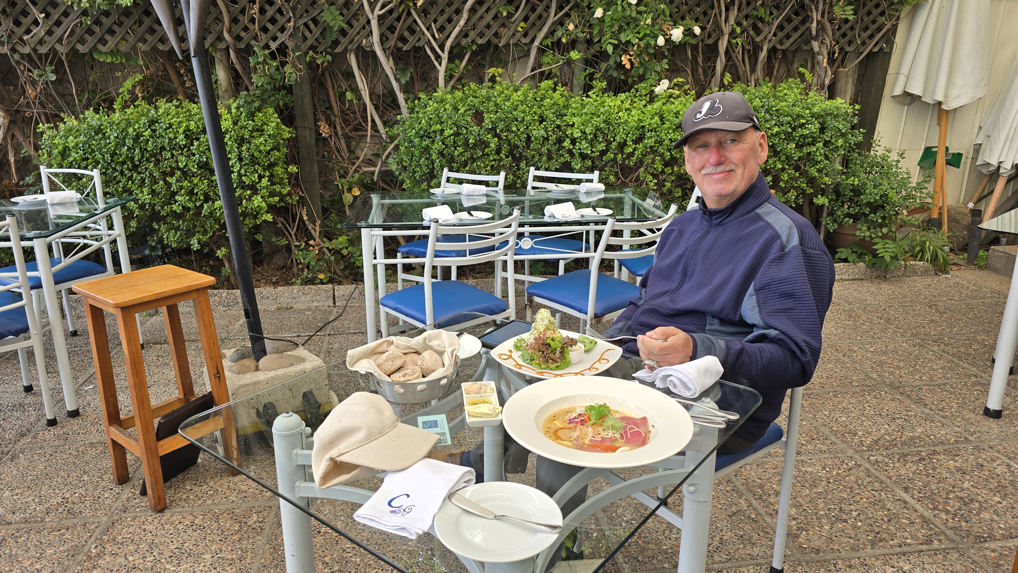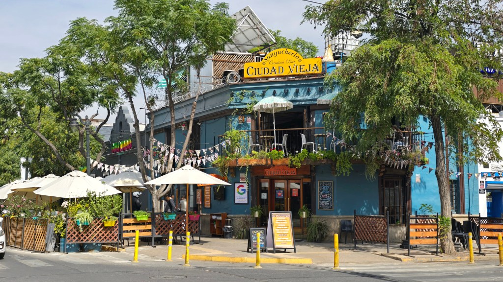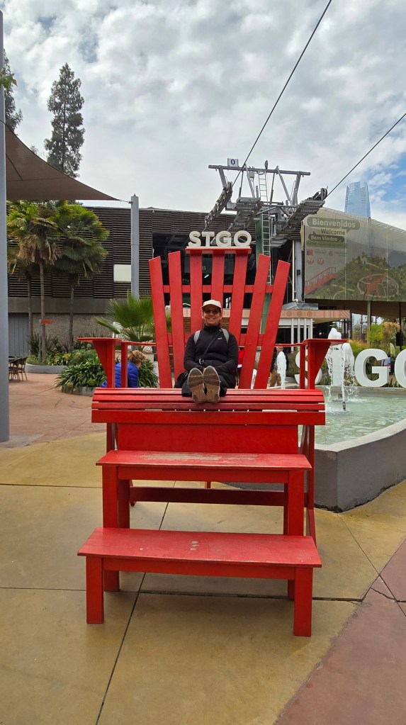 Nous avons emprunté un petit chemin de 100m de long menant à la station Cumbre, située sur un autre versant de la montagne. Nous sommes descendus en téléphérique jusque dans le quartier Providencia, admirant la vue sur la Gran Torre Santiago (Costanera Center) et les pics enneigés. À l’arrêt obligatoire tout en bas, à la station Oasis, nous avons pris quelques photos (chaise géante avec les lettre STGO (Santiago) en arrière-plan) avant de redéfaire notre chemin: téléphérique jusqu’en haut et funiculaire jusqu’en bas. De la station Pío Nono, nous avons marché sur la Calle Conquistador du quartier bohème Bellavista, reconnu pour ses maisons colorées et ses cafés. Nous avons dîné sur la terrasse du restaurant Viva La Vida. Ce restaurant offre des mets chiliens traditionnels. Claude et moi avons commandé le menu du jour que nous nous sommes partagé : crème d’épinard, poulet mongolien, légumes sautés et crème glacée aux petits fruits (20$CAD incluant une petite bouteille d’eau gazéifiée et un pourboire de 10%. Ce n’est pas donné mais la nourriture était succulente!)