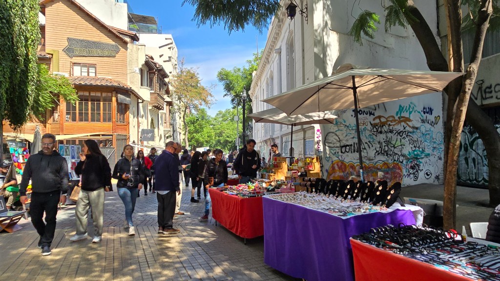 En arrivant à la Plaza Mulato Gil de Castro, sur la rue José Victorino Lastarria, nous avons tout de suite apprécié l’ambiance bohème. On y retrouve artistes peintres, kiosques d’artisanat, restaurants, cafés, etc. Je suis allée jeter un coup d’oeil à l’intérieur de l’église Veracruz, déclaré monument historique en 1983. (Ce temple catholique a été gravement endommagé par un incendie déclenché par des individus cagoulés lors de l’épidémie de COVID-19. Les murs de ciment abimés sont des vestiges du triste événement.)