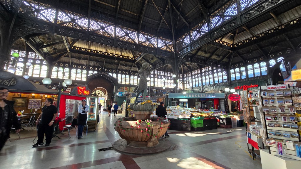 Nous avons fait une pause-café-brioche, assis à une petite terrasse au soleil. Nous avons ensuite poursuivi notre marche jusqu’au Mercado Central situé au bout du Parque Forestal. L’intérieur de l’édifice est impressionnant avec son haut toit en fonte et l’originalité de sa structure métallique. (Ce marché a été inauguré en 1872. Il a remplacé la Plaza del Abasto, détruite par un incendie en 1864.) On y vend du poisson, des fruits et des légumes. À la sortie du marché, nous sommes tombés sur une rue piétonne fort achalandée et remplie de kiosques de fruits, légumes, vêtements, etc. Nous avons acheté de savoureux raisins verts et fraises. Au bout de cette rue, surprise, nous sommes arrivés à la Plaza de Armas que nous connaissions déjà. Fatigués de nos 11 200 pas de la journée, nous avons pris un Uber Taxi pour revenir à notre hébergement. Claude nous a cuisiné un excellent souper de poisson (congre) et légumes. Nous avons fini la soirée dans notre petite chambre, appréciant ce moment de détente bien mérité.