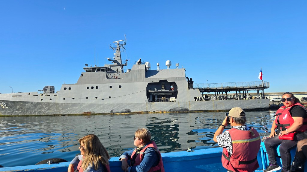 De la Plaza Sotomayor, nous nous sommes dirigés vers le port de mer. J’ai acheté quelques souvenirs de Valparaiso pour nos petits-fils et nous avons ensuite fait une excursion de trente minutes en bateau à moteur dans la baie (5 000$CLP ou 7.45$CAD chacun). Sur l’eau, comme la vue sur la ville était magnifique! Nous avons pu voir des loups de mer de très près, des bateaux de guerre, une réplique du voilier espagnol Esmeralda, d’immenses bateaux cargos remplis de gros conteneurs, etc. Le jeune guide chilien nous a donnés plusieurs informations historiques mais malheureusement, son espagnol était très difficile à comprendre avec le bruit de fond venant des moteurs. Peu importe, la balade en bateau en valait la peine.