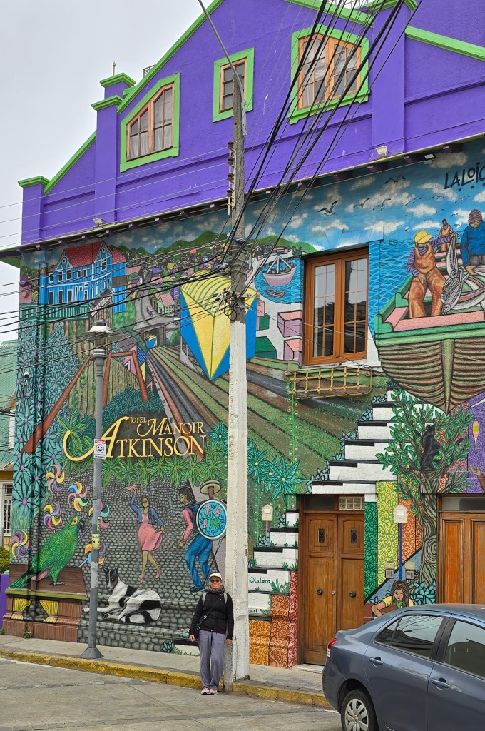 Vers 11h am, Claude et moi avons descendu les escaliers qui mènent à la basse-ville. Nous avons marché jusqu’à l’Ascensor Reina Victoria (100$CLP ou 0.15$CAD chacun). En débarquant du funiculaire sur le Cerro Concepción, nous avons été charmés par les étroites rues hautement colorées. Des artistes peintres et des artisans bijoutiers attendent patiemment les clients dans ce décor multicolore des plus attrayant. Nous avons trouvé plusieurs miradors permettant d’apprécier la vue sur les collines et l’océan. Nous avons aussi découvert l’Église Luthérienne (1897, restaurée en 2011), un cimetière, le fameux Manoir Atkinson (hôtel), l’Ascensor Concepción (1883), le Paseo Gervasoni, le Paseo Yougoslava, le Museo Baburizza (immense édifice à l’architecture yougoslave), l’Ascensor El Peral et le mirador principal du Cerro Alegre.