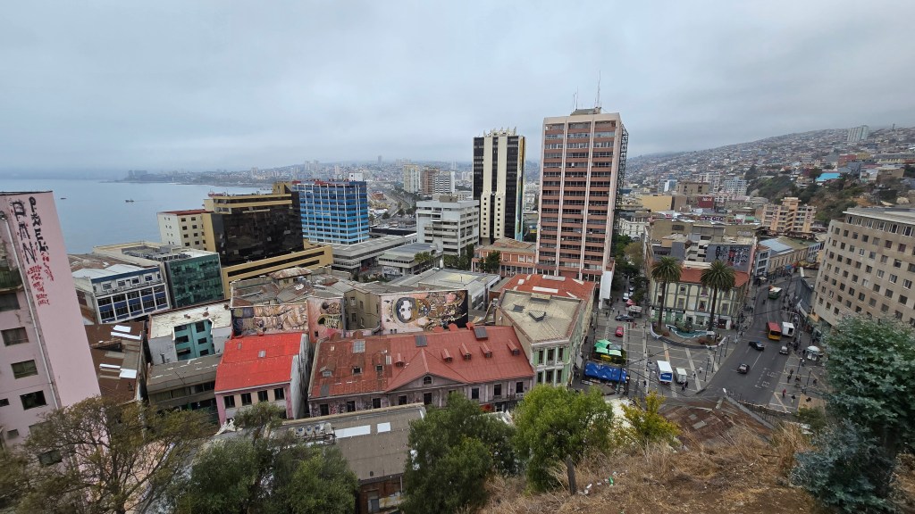 À notre arrivée à Valparaiso, nous avons été étonnés par la densité de la population. La baie est entourée de montagnes habitées jusqu’aux sommets. Les cinq rues principales en contrebas sont très achalandées et les bâtiments vieillots. L’air pollué nous pique les yeux et l’odeur du gaz carbonique est omniprésente. Cependant, la ville a son charme et impressionne avec ses 42 miradors, ainsi que ses ruelles et maisons hautement colorées.