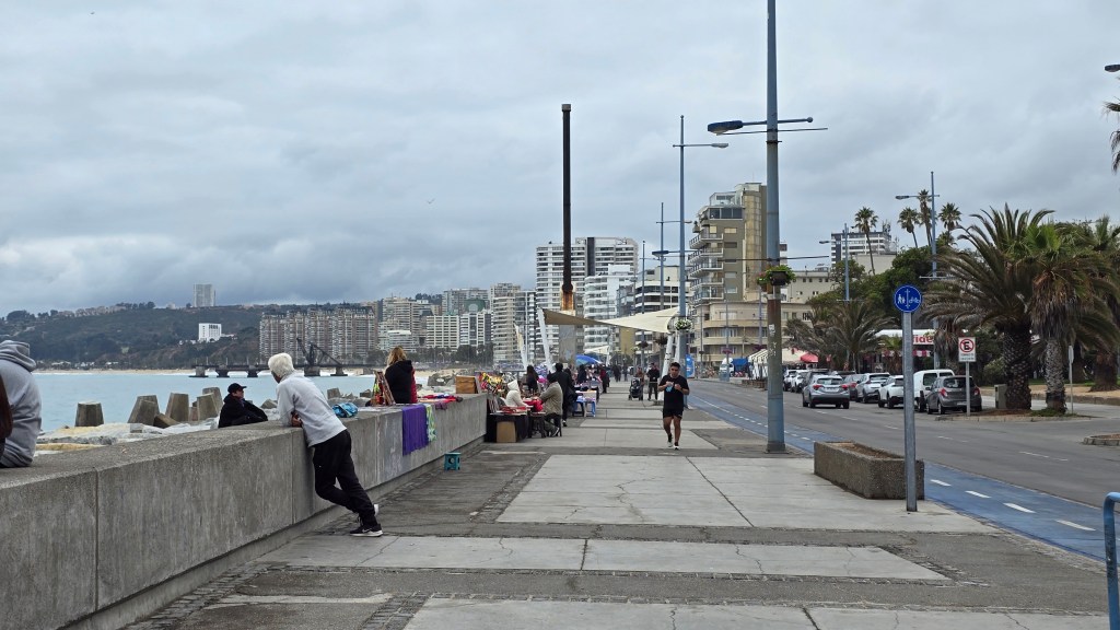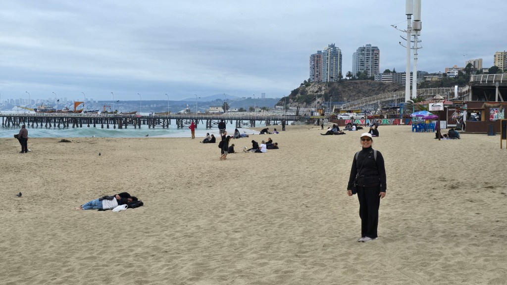 Notre sommeil a été un peu perturbé par la musique d’un bar qui ne s’est arrêtée qu’à 5ham. Heureusement, nous avions nos bouchons d’oreilles! Nous avons déjeuné et avons pris notre temps avant de sortir, attendant que l’épaisse brume se disperse. Vers 11ham, nous avons descendus le long escalier menant à la rue Bellavista en contrebas. Nous nous sommes dirigés tout droit vers la station ferroviaire du même nom. Nous avons acheté nos billets sur place et quelques minutes plus tard, nous montions à bord du train. Nous nous sommes rendus à la station Viña del Mar (À 6 stations et environ 10 minutes de Valparaiso). Nous pensions arriver directement à la plage mais au lieu de cela, nous étions à près de 1.8km de celle-ci. Nous avons emprunté l’Avenida Valparaiso, artère commerciale et très achalandée, puis nous avons bifurqué pour rejoindre l’Av. Marina, en bord de mer. Nous avons découvert l’ancien bateau de croisière Cap Duval, amarré en permanence et converti en hôtel et restaurant avec vue sur l’Océan Pacifique. Quelques mètres plus loin, le Castillo Wulff semble tout droit sorti d’un conte de fée avec ses tours construites directement sur les rochers sur lesquels les vagues puissantes de l’océan viennent frapper. Nous avons fait une pause au mirador situé juste à côté du château, observant le mouvement des fortes vagues et admirant les côtes habitées de Viña del Mar.