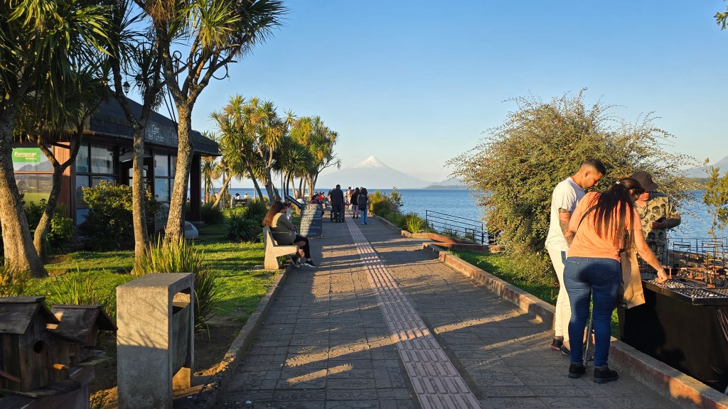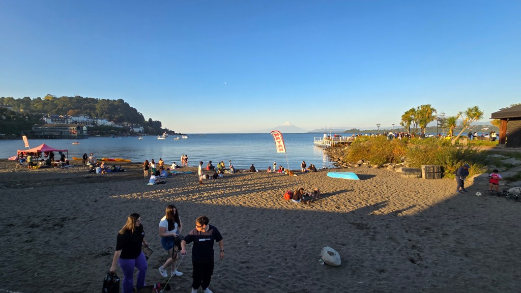 Après nous être rapidement installés, nous avons descendu la rue et avons découvert le petit centre-ville qui, avec ses bâtisses et maisons de style européen, nous font complètement oublier que nous sommes au Chili. Une feria (fête foraine avec marché local, musique et danse)avait lieu à la Plaza de Armas, dans un immense hangar. Nous nous sommes rendus au bord du magnifique lac. On y retrouve une Casa del Turista, un mirador, une plage avec quelques kayaks sur la berge, et plusieurs restaurants situés de l’autre côté de la rue.