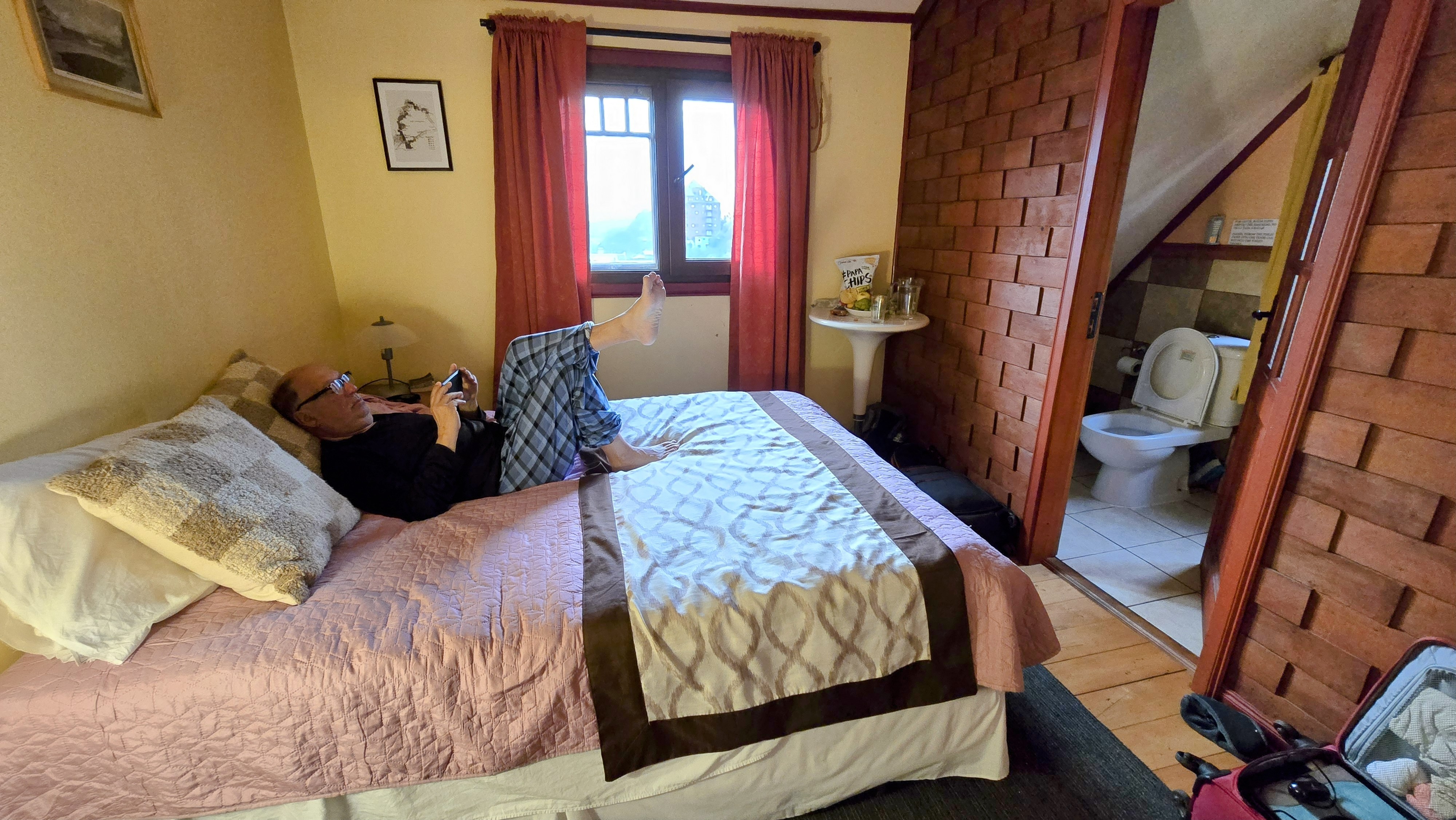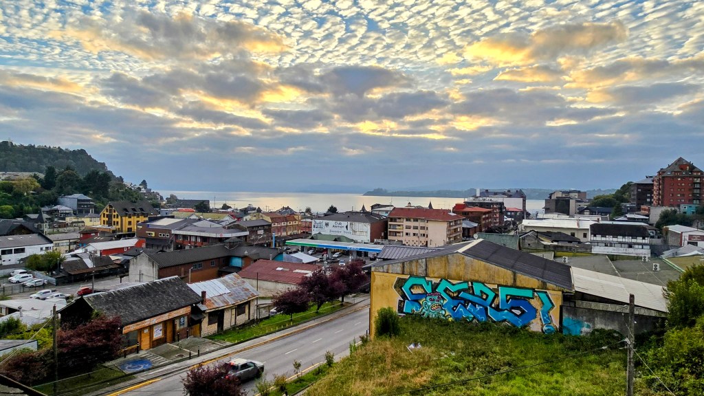 À notre arrivée à la gare routière de Puerto Montt, nous avons pris un taxi Uber jusqu’à l’Hôtel Le Mirage. Situé à moins d’un kilomètres du centre-ville, ce vieil hôtel est tout de même commode et propre. Nous nous sommes installés dans notre chambre aux murs roses dont la grande fenêtre donne sur une petite rue secondaire. Nous sommes ensuite descendus au salon afin d’y lire les nouvelles sur notre cellulaire en attendant que la pluie cesse.