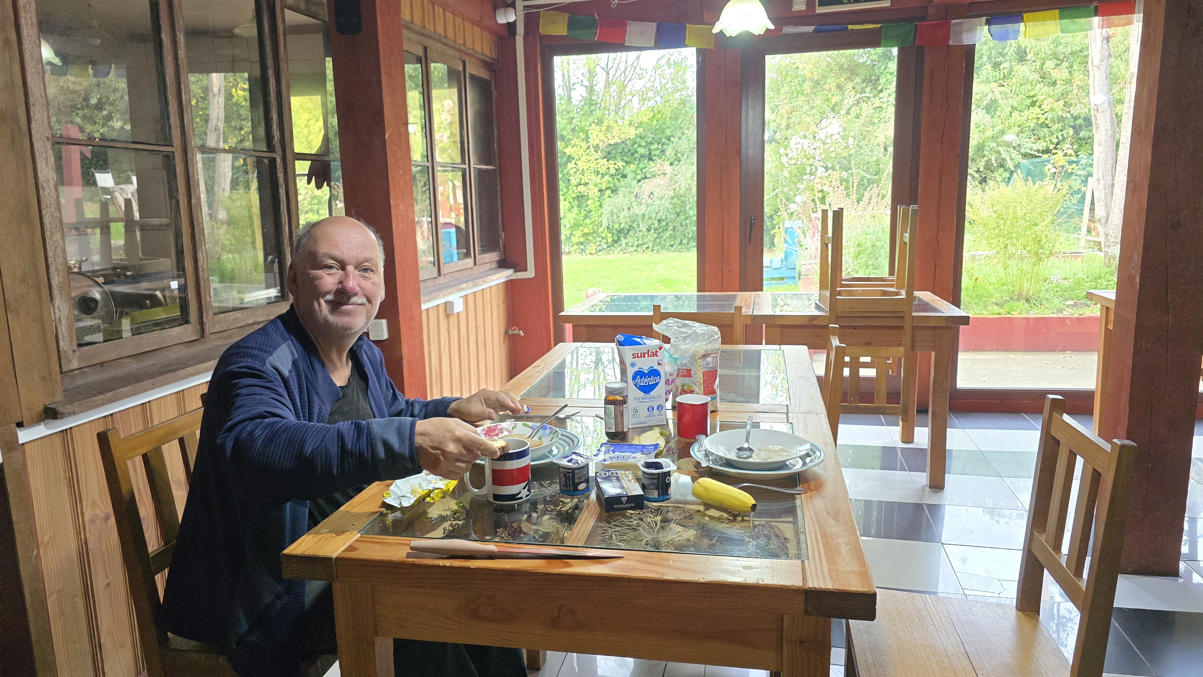 Ce matin, nous avons pris un bon petit déjeuner à notre goût avec des oeufs et du pain intégral. Quel luxe après en avoir été privés pendant un mois! En attendant que l’épais brouillard se lève, je me suis installée à la table de cuisine, devant la fenêtre avec vue sur la montagne, et je me suis presque mise à jour dans mon journal de voyage.