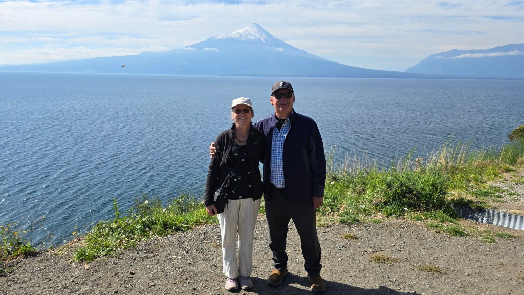À la station Parajitos, premier arrêt dans la capitale, nous avons pris un autocar nous menant directement au terminal 1 de l’aéroport. Confortablement installée à la table d’un petit café, j’ai écrit mon journal à l’ordinateur. Claude et moi avons ensuite partagé une excellente pizza végétarienne avant de nous rendre à la porte d’embarquement. Notre vol Santiago – Puerto Montt, d’une durée de 1h30m, a vite passé. Nous sommes arrivés en milieu d’après-midi à Puerto Montt. Du hublot de l’avion, quelques minutes avant l’atterrissage, c’est avec émerveillement que nous avons pu apercevoir les deux impressionnants volcans aux pics enneigés et le magnifique lac Llanquihue.