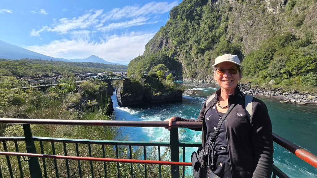 Nous avons fait un deuxième arrêt aux Saltos del Petrohué (7500CLP ou 11$CAD par personne). Ces cascades impressionnantes sont situées dans le Parc national Vicente Pérez Rosales, à environ 50 km à l’est de Puerto Varas. Ces chutes d’eau se forment lorsque la rivière Petrohué dévale des formations de lave basaltique solidifiée, issues des éruptions passées du volcan Osorno. Le contraste entre les eaux turquoise et les roches sombres, avec le volcan Osorno en arrière-plan, offre un spectacle naturel saisissant. Facilement accessibles depuis Puerto Varas via la route 225, les Saltos del Petrohué constituent une excursion incontournable pour les amoureux de la nature visitant la région des Lacs. (Référence: ChatGPT)