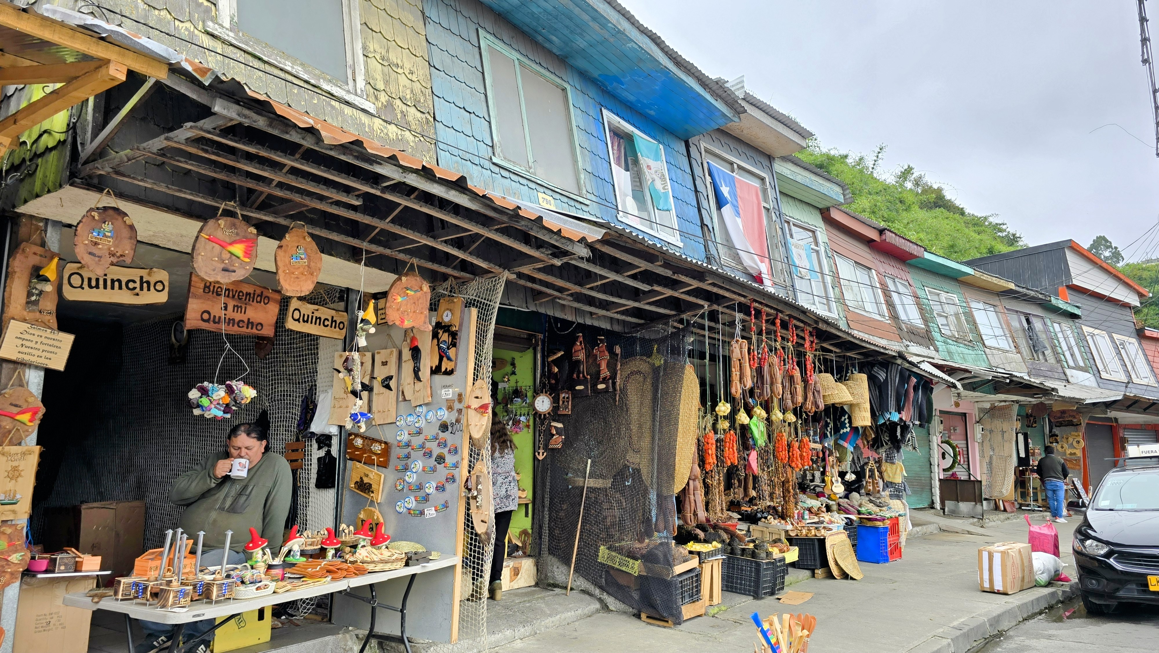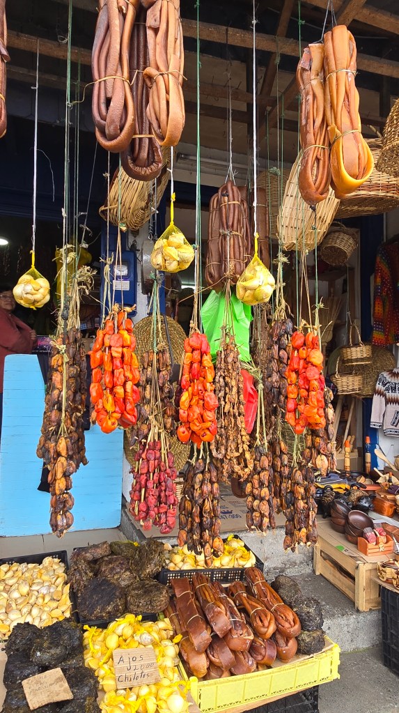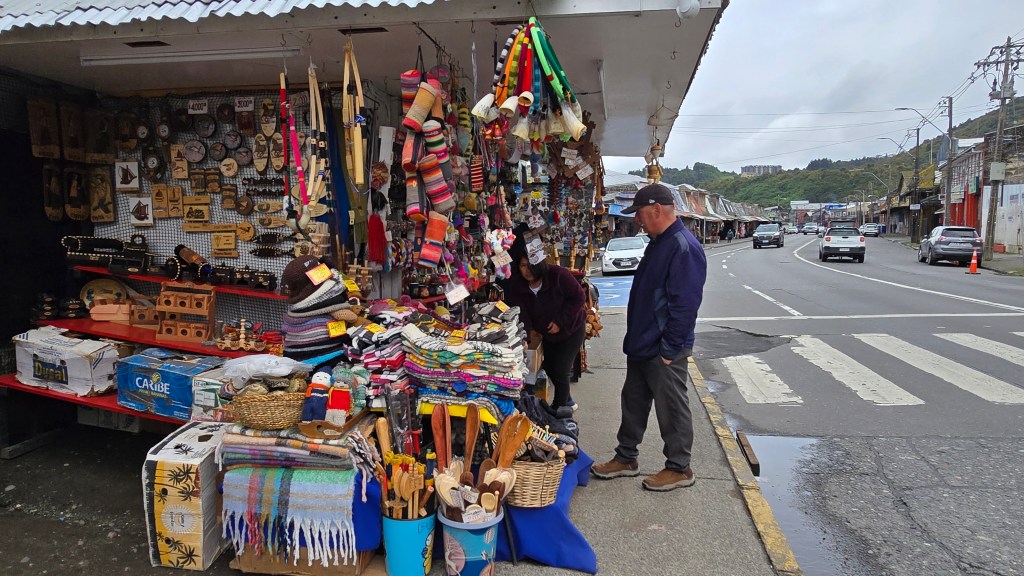 Le marché artisanal de Dalcahue est réputé pour ses produits locaux authentiques, notamment des textiles en laine, des objets en bois et des paniers en osier, reflétant le savoir-faire des artisans de Chiloé. (J’y ai acheté un bandeau en laine, une tuque tricotée en forme de poisson et des boucles d’oreilles en macramé en forme de hiboux.)