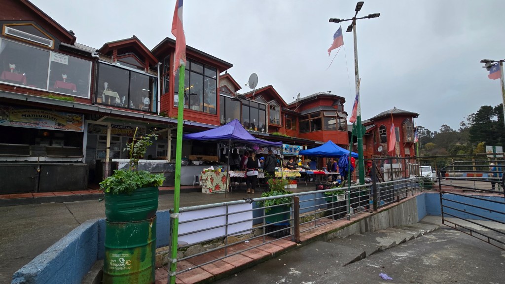 Nous sommes passés devant une multitude de mini maisons en rangée abritant des étals d’artisanat dont plusieurs n’étaient pas encore ouverts. Tout au bout de la rue, nous sommes arrivés au fameux Marché d’Angelmó.