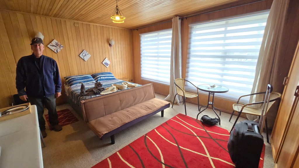 À notre arrivée à la petite gare routière de Castro, nous avons acheté à l’avance notre billet de retour à Puerto Montt et sommes partis en taxi à notre nouvel hébergement, la habitación Mañio sur l’Avenida Galvarino Riveros. Nous avons récupéré les clés de notre studio en suivant les instructions envoyées par vidéo, via WhatsApp, par le propriétaire. Nous nous sommes installés dans ce studio fort confortable et pratique. La pièce grande et très éclairée avec deux grandes fenêtres donnant sur la rue. Nous avons un petit réfrigérateur, un micro-ondes, une bouilloire, de la vaisselle, un petit coin salon, une petite table ronde avec deux chaises, de grandes armoires murales, une grande salle de bain, une belle salle commune fort éclairée et agrémentée de nombreuses plantes, une machine à café à notre disposition, etc.