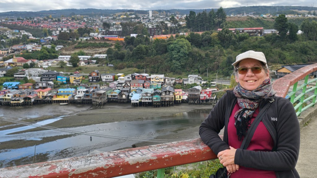 Avant de sortir, notre hôte, un charmant Chilien dans la quarantaine, est venu se présenter. Avec la remarquable gentillesse chilienne, il nous a donné des suggestions de choses à faire à Castro. Nous avons marché jusqu’au Mirador Millantuy. La vue sur le cimetière, les montagnes, la baie et les maisons colorées sur pilotis (palafitos) est magnifique. Nous avons descendus les escaliers et nous nous sommes rendus au Mirador Gamboa, offrant une vue d’un angle différent sur les palafitos. Nous avons fait une pause-chausson aux pommes dans le petit parc situé juste à côté de ce deuxième mirador avant de poursuivre notre marche vers la cathédrale San Francisco.