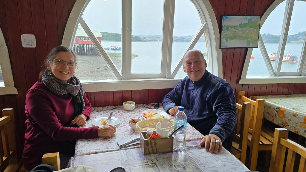 Partant de la Plaza de Armas, nous avons descendu la rue commerciale Blanco Encalada menant à la promenade du bord de mer, la Costanera, et au marché artisanal de Castro. Nous avons exploré cette zone avant d’aller souper au restaurant sur pilotis, le Brisas Del Mar. Nous avons partagé un consommé aux crevettes et du saumon « à la plancha ». Quel délice!