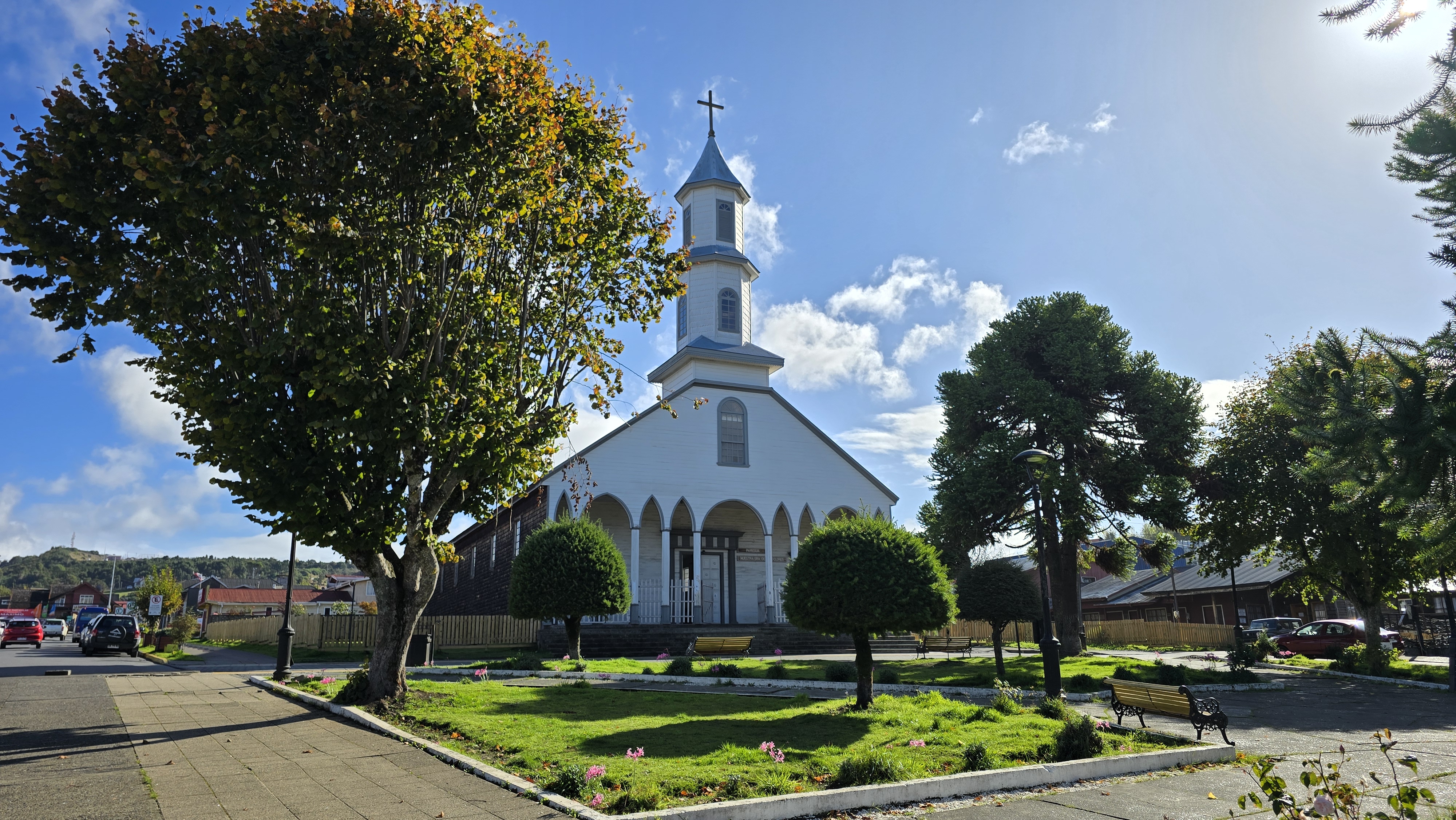 La Plaza de Armas de Castro, située devant la cathédrale San Francisco, est le cœur vibrant de la ville de Castro, sur l’île de Chiloé. Cette place quadrangulaire, typique des tracés coloniaux, est entourée de jardins soignés et de bancs invitant à la détente. Elle est également bordée de bâtiments traditionnels, reflétant le riche patrimoine architectural de la région. En son centre, on trouve des monuments et des sculptures qui célèbrent l’histoire et la culture locales. L’un des éléments notables est un hémicycle coloré orné de mosaïques représentant le plan de Chiloé et des motifs culturels emblématiques tels que les palafitos et la mer. La place est également dotée d’une concha acústica, une scène en plein air utilisée pour des événements culturels et des concerts. La Plaza de Armas est un lieu de rencontre central pour les habitants et les visiteurs, offrant une atmosphère animée, particulièrement en soirée lorsque des musiciens locaux s’y produisent et que des artisans proposent leurs créations. (Référence: ChatGPT)
