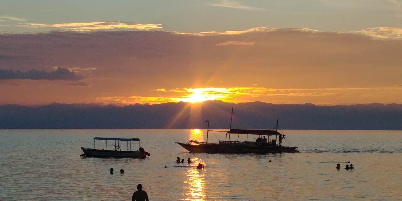 We spent the afternoon at the beach, alternating swimming and lazing on the sun loungers in the shade of a tree. The Sulu Sea is dark blue, refreshing and on a soft sand background. Dauin beach is large and Filipinos come for a swim. It is a marine protected area with abundant marine flora and fauna.